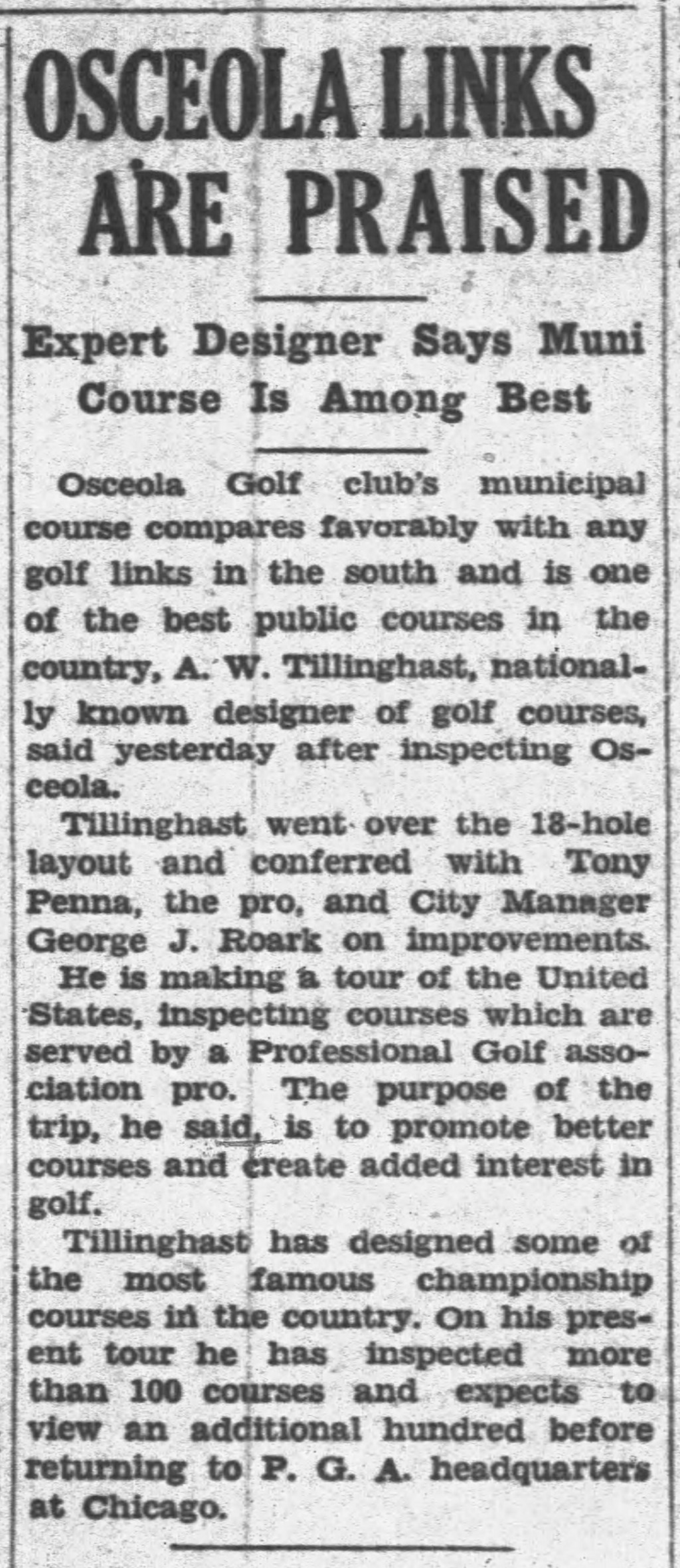 On December 29, 1935, Osceola Golf Course got a visit from Albert W. Tillinghast, one of America’s most renowned golf course architects. At the request of Osceola golf pro Tony Penna, Tillinghast had stopped in Pensacola to inspect the golf course as part of his work with the PGA. After walking the course with Penna and suggesting improvements, Tillinghast stated that Osceola compared favorably with any golf links in the south and was one of the best public courses in the country.