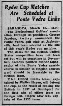 The Ocean Course was selected as the site for the 1939 Ryder Cup Matches. United States Captain Walter Hagen said that the selection of the Ponte Vedra course was a very sporting gesture toward the English team, since their players felt at home on links by the sea where the wind plays tricks. The already difficult layout was lengthened to 6,829 yards in anticipation of the matches.
